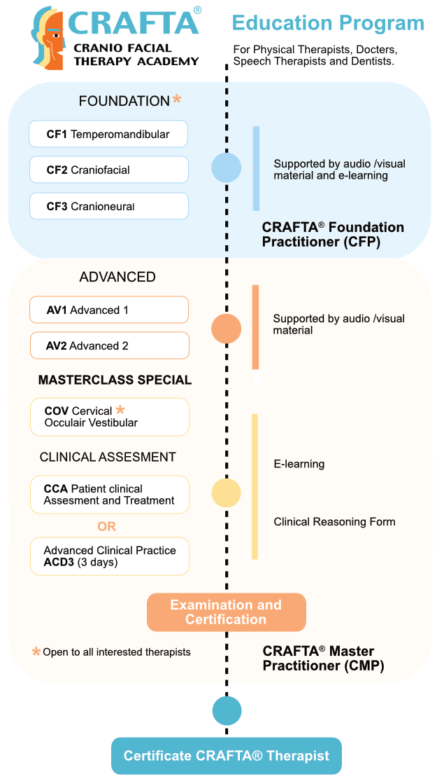 Het CRAFTA®-curriculum is het resultaat van de consensus van diverse tandartsen en fysiotherapeuten. De cursussen worden elke zes maanden bijgewerkt en volgen de Europese accreditatierichtlijnen (aanbevelingen van Bologna).